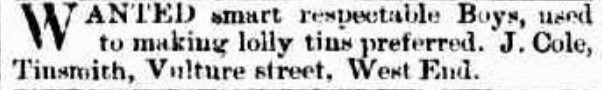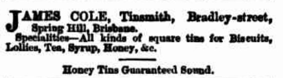 Soon after their arrival, James established a lamp and tinsmith manufacturing business at Bradley Street, Spring Hill. The tinsmith side of the business soon became the dominant one. In the 19th century, containers made from tin plated steel played an important role in food storage, along with heavier glass and stoneware containers.