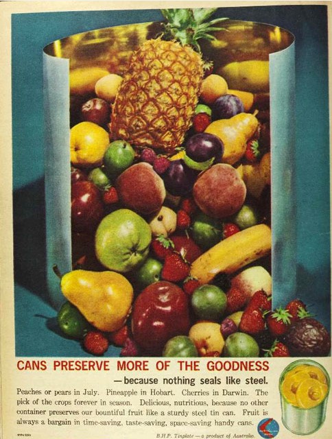 Australian manufacture of tinplate was not to commence until 1958, by which time the national annual production of cans had reached 1,000 million a year. In 2007, production ceased and Australian can manufacturers once again rely on imported tinplate.