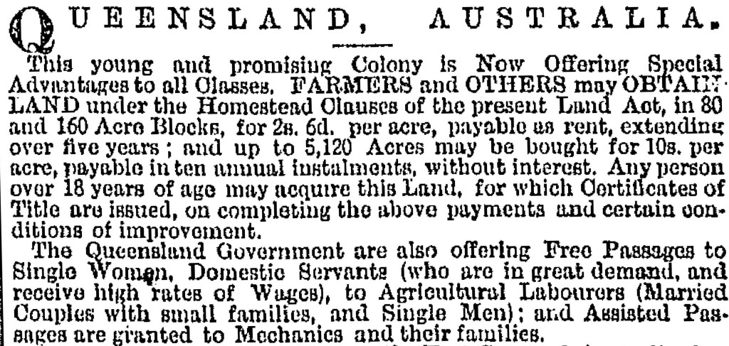 The Colony of Queensland was offering assisted passages from Britain and James, as a “mechanic’, as artisans and tradesmen were then called, qualified. In 1883, the couple accompanied by James’ sister Alice, left for Australia. They had no children.
