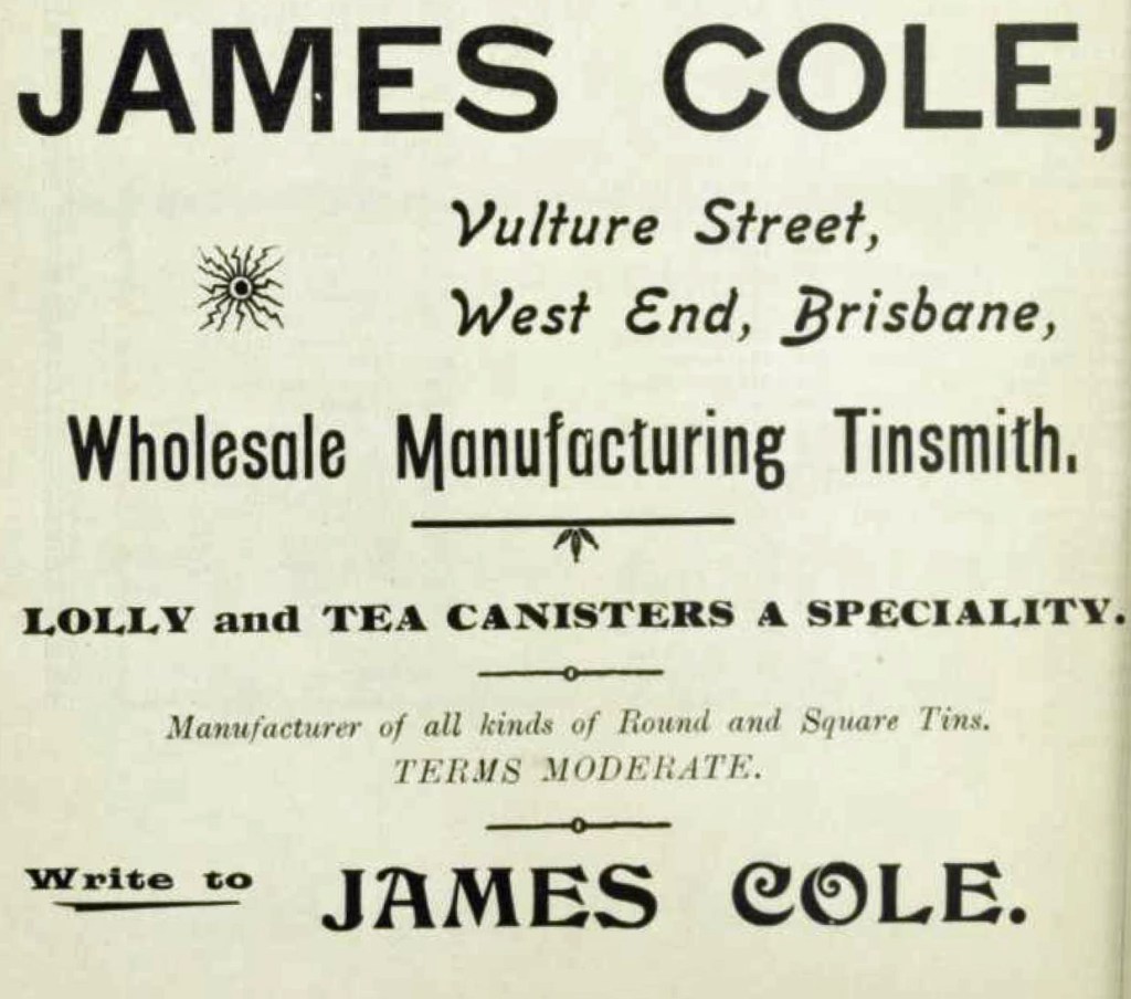 By 1895, James had moved his business to Manning Street, South Brisbane, where he developed his “Perfect” brand honey extractor. The year 1896 saw Cole established at his final location on Vulture Street, opposite the West End State School.