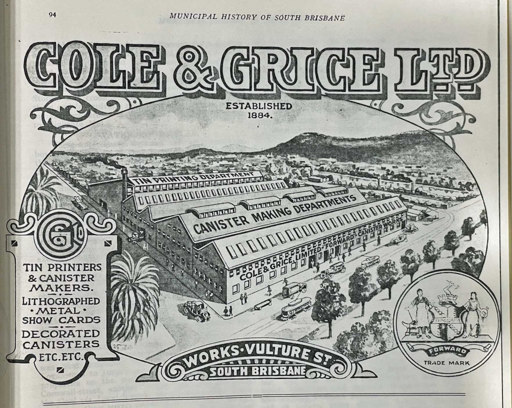 Cole and Grice saw an opportunity to commence the production of tins for various products, using the latest technology. A 1924 newspaper article based on a visit to the West End factory described newly installed machinery capable of making 2 pineapple tins a second. A flatbed tin printer enabled 960 tin sheets to be printed in colour per hour. It was the only factory in Brisbane producing both tins and labels.