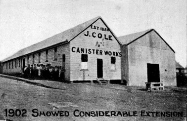 In the 1902 image below, Cole has changed his sign from “Tinsmith” to “Canister Works”. With the advent of the internal combustion engine, the use of canisters had grown from food products to include storage of lubricating oil and petroleum.