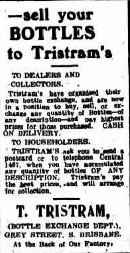 The supply of bottles was a problem, and in 1917 Tristram’s initiated a collection scheme of their own, rather than rely on third party “bottle-ohs” to collect bottles door to door.