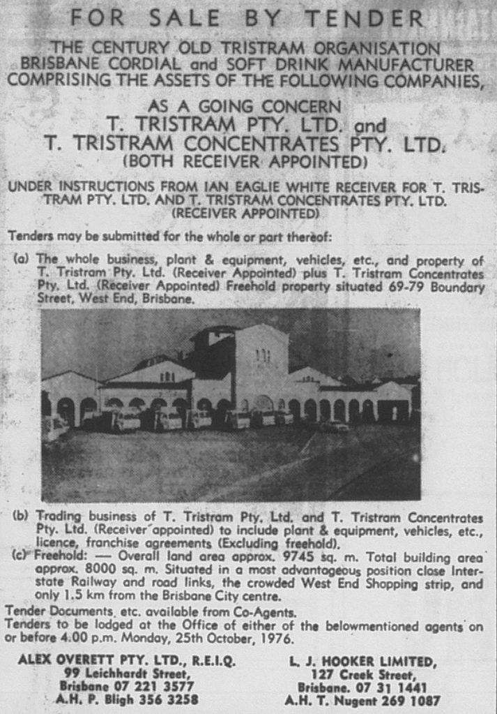 By 1976, the struggle for profitability with increasingly large competitors was lost, and Tristram’s was placed into the hands of receivers. Cadbury-Schweppes purchased the trading business, and the Boundary Street factory was sold in 1979.
