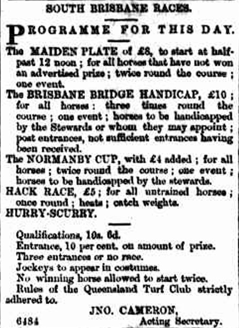 The Brisbane races fell into abeyance after 1865, perhaps not coincidentally the year when the Queensland Turf Club began races at Ascot. A group of South Brisbane enthusiasts revived the races in 1873 and 1874. The organising committee included such well known people as the auctioneer John Cameron, who served as secretary. On race day, he also had the unenviable job of handling the finances, and he “performed those delicate duties with his accustomed tact and ability”.