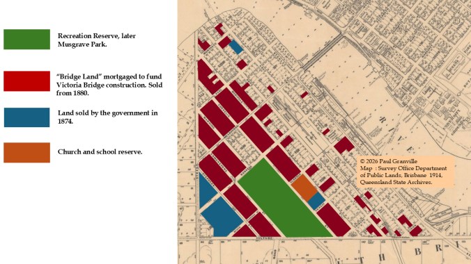 Almost all the land traversed by races over the years was either part of the recreation reserve or “Bridge Lands”. In 1883, the recreation reserve trustees belatedly received the title deeds, and the land was fenced and renamed Musgrave Park (my post Musgrave Park – The Early Days gives the full story). The Bridge Lands had been mortgaged in 1864 to fund the construction of the Victoria Bridge. From 1880, this land was finally auctioned and subsequently developed (see my post The Fascinating Story of the First Victoria Bridge). The open fields had gone, and the South Brisbane Races went with them.