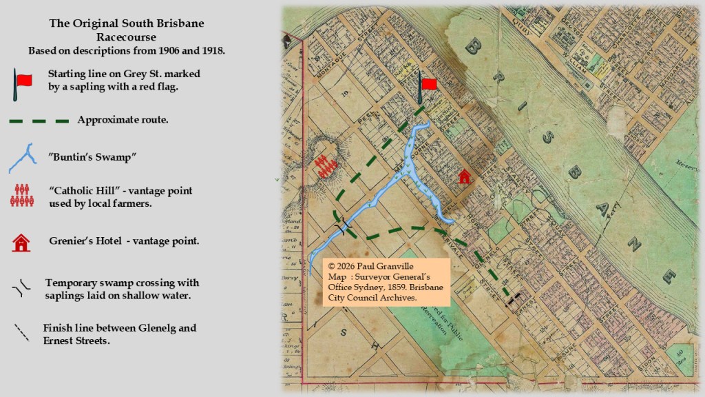 Horses crossed the swamp near Manning Street where the water was usually only about 8 cm. deep. Saplings laid across this narrow section of swamp assisted the horses to cross. They then swung left to avoid the rise in ground near Edmondson Street, crossing Cordelia and Russell Streets to finish the race galloping along what is now Merivale Street. The finish line was described as on the flat near the later location of the South Brisbane State School extension.