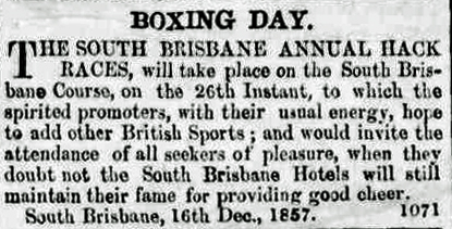 From 1853 to 1865, race days were held in South Brisbane, variously on Boxing Day or New Year’s Day, and occasionally mid-year. The organisers tried to avoid clashes with races at Coopers Plains, New Farm and, from 1865, at Ascot. The South Brisbane races were revived in 1873, and the last occurred in 1874 to celebrate the opening of the Victoria Bridge.